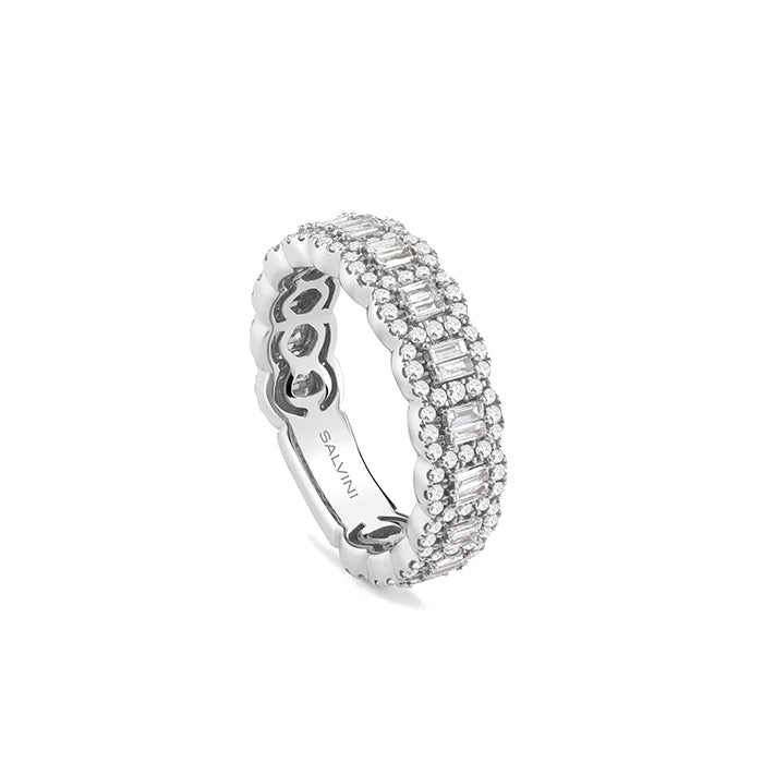 Raffinata e luminosa, la veretta semi-intera della collezione Magia di Salvini è un gioiello che esprime eleganza e significato. Realizzata in oro bianco e impreziosita da diamanti taglio rotondo e baguette, è perfetta per celebrare i momenti più importanti della vita, come anniversari, promesse o traguardi speciali.