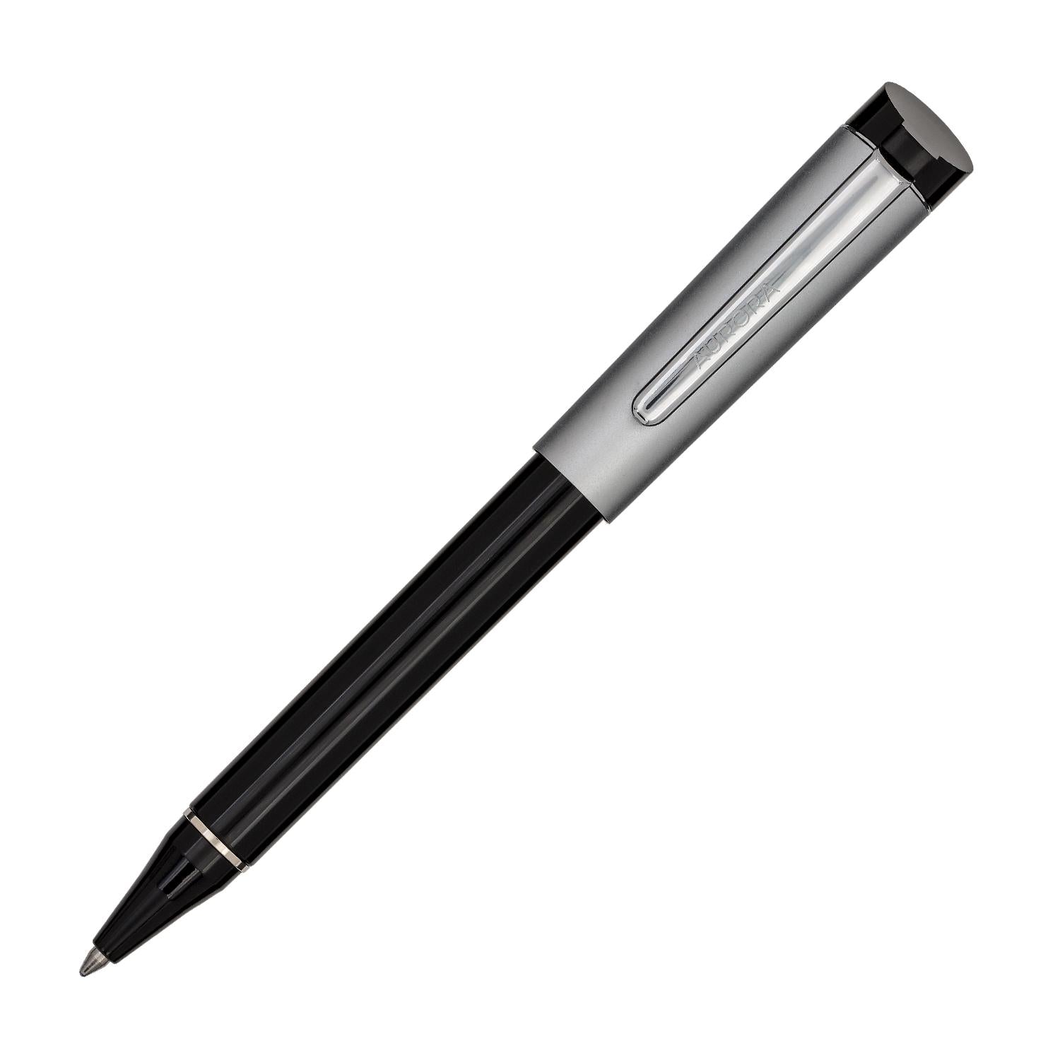 Penna Aurora in resina nera con finiture colore argento. Tipo di scrittura a sfera.