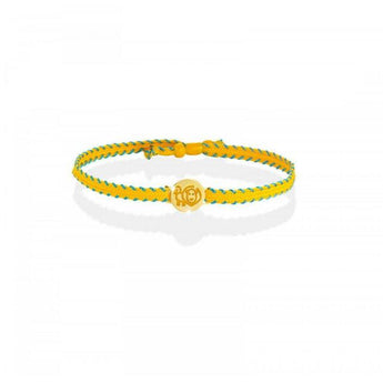 Bracciale in oro giallo 9kt con disegnato il segno del Leone con smalto giallo, il cordino è in canvas. La misura è regolabile in lunghezza.