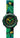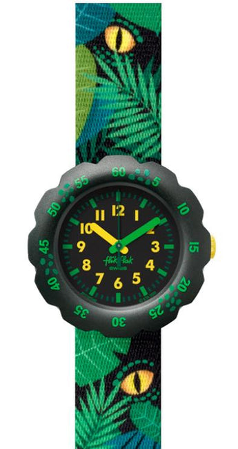 Orologio Flik Flak, referenza ZFPSP049, cassa in metallo, il quadrante è nero con numeri gialli e indici verdi, la resistenza all'acqua è di 3 atm. Il meccanismo è al quarzo Swiss Made. Il cinturino in stoffa lavabile è a tema dinosauri.
