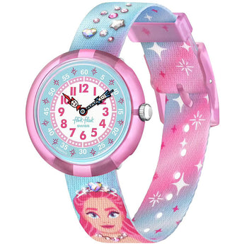 Scopri l'orologio Sparkle Kingdom di Flik Flak, un orologio solo tempo pensato per i bambini, appartenente alla collezione Shine Bright (2023). Con una cassa rotonda in plastica di origine biologica di colore rosa trasparente, questo orologio ha un diametro di 31,85 mm, ideale per il polso dei più piccoli. Il design vivace e allegro è perfetto per accompagnare ogni bambino nelle sue avventure quotidiane.