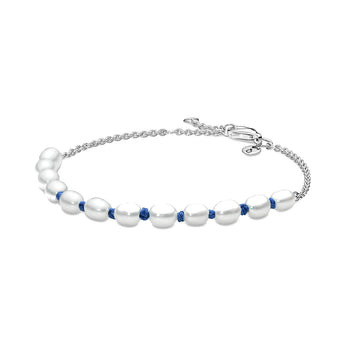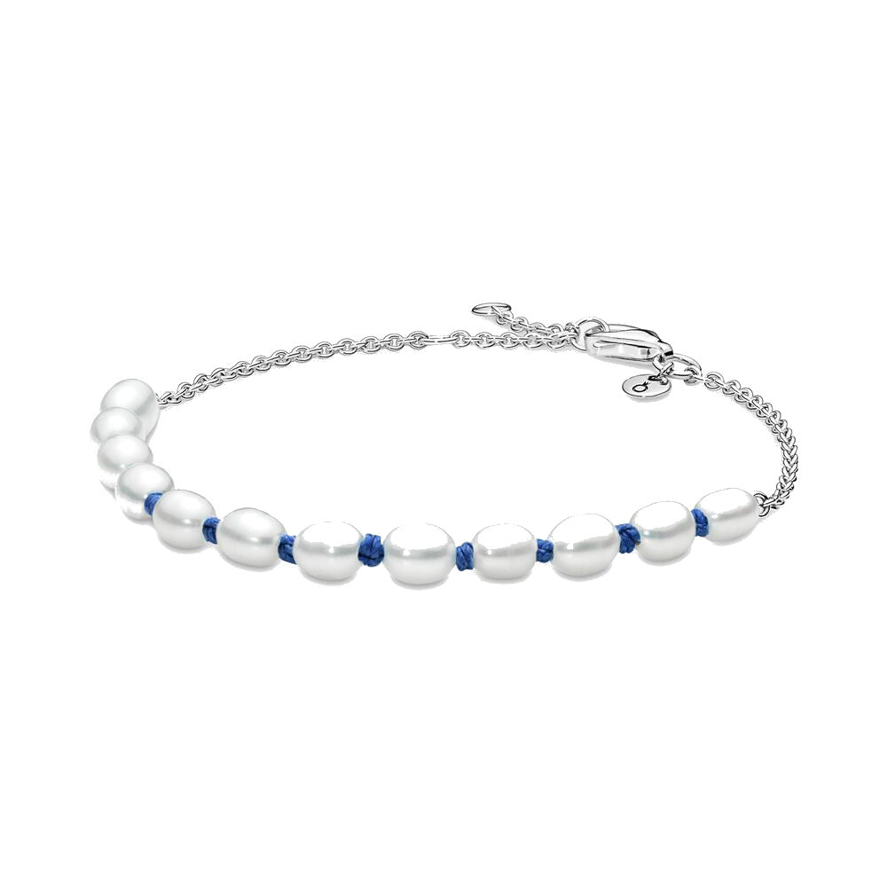 Il bracciale presenta una metà costituita da una fila di perle coltivate d'acqua dolce inserite in un cordino blu annodato. L'altra metà è in argento sterling 925 con chiusura a moschettone ed è decorata da un piccolo disco vicino alla chiusura che reca incisa la O coronata Pandora. Nota bene: con materiali naturali come le perle può verificarsi una normale usura.