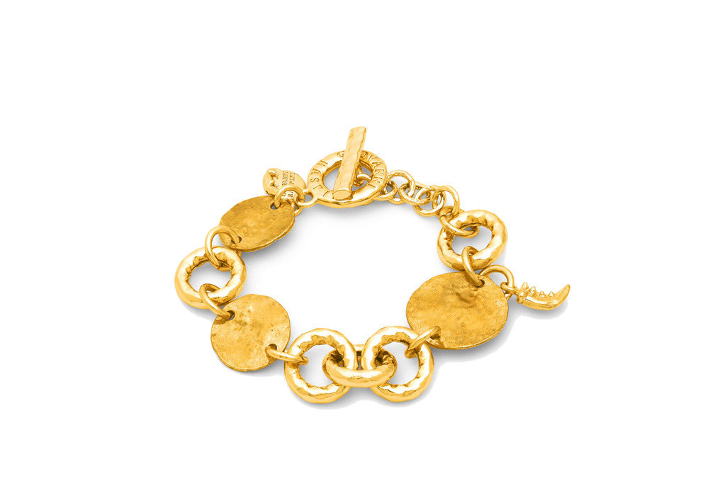 Eleganza artigianale e carattere deciso si incontrano in questo bracciale a maglia tonda in bronzo dorato 18 kt, realizzato con la preziosa tecnica della fusione a cera persa. La finitura martellata, luminosa e irregolare, valorizza i riflessi caldi del metallo, mentre gli eleganti dischi decorativi e l'originale dettaglio ad artiglio aggiungono un tocco distintivo e contemporaneo. La chiusura a T-bar completa il design con praticità ed estetica ricercata.
