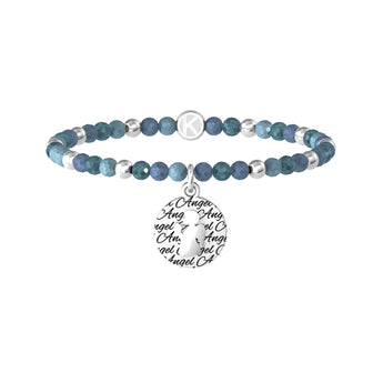 Bracciale elastico con agata azzurra e ciondolo tondo in acciaio satinato con cristallo e scritta "Angel".