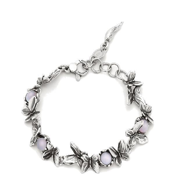 Bracciale Giovanni Raspini con farfalle, realizzato in argento 925 con lavorazione lucida e brunita. La lunghezza è 19 Cm con chiusura a moschettone e maglie di regolazione.