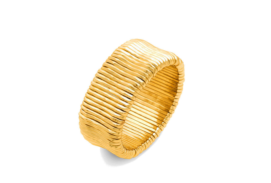 Questo bracciale presenta una texture dinamica e contemporanea, studiata per catturare la luce con giochi riflessi che conferiscono al gioiello un'eleganza vibrante e moderna. All'interno, le molle nascoste garantiscono un'indosso confortevole e adattabile, rendendo il bracciale facile da portare in ogni occasione.
