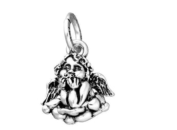 Ciondolo Giovanni Raspini angelo su nuvola, realizzato in argento 925 con finitura lucida e brunita. L'altezza è di 1,7 cm (esclusa la maglia di 0,9 cm).