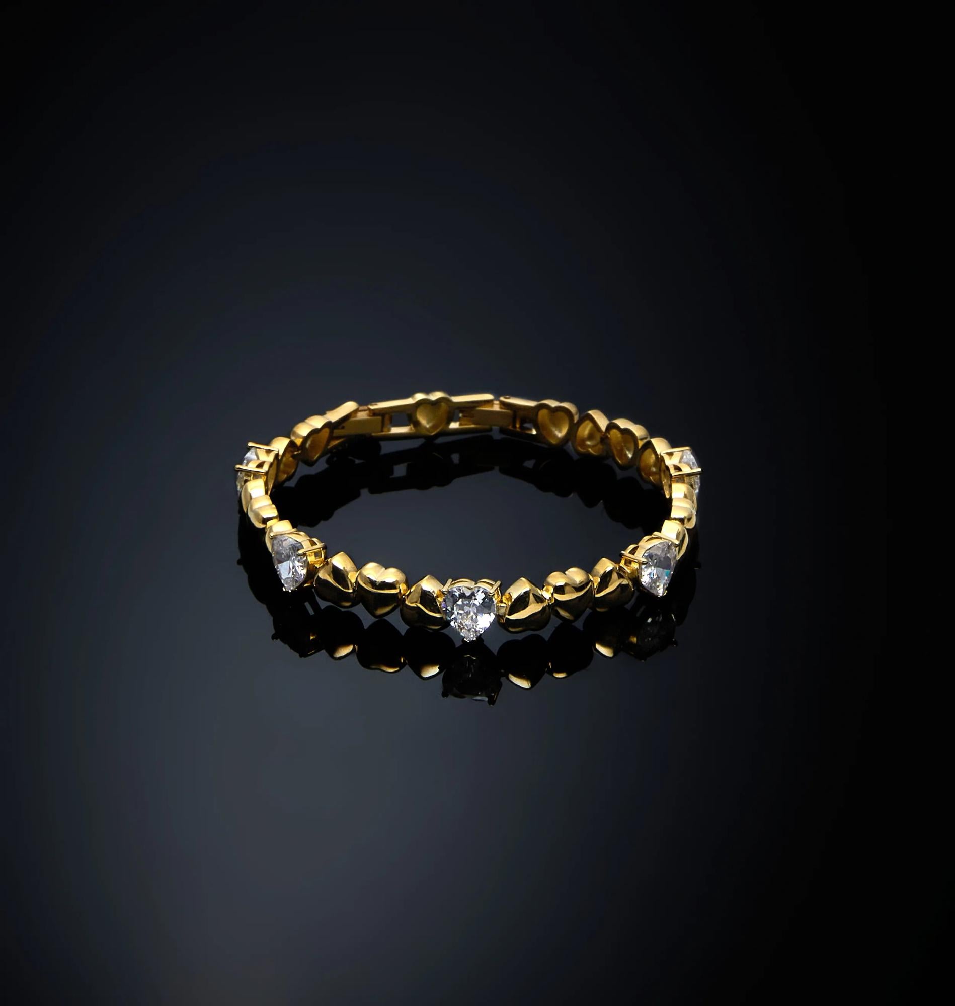 Bracciale Chiara Ferragni Brand della collezione cuoricino, realizzato in metallo placcato oro 18k e pietre a forma di cuore trasparenti.