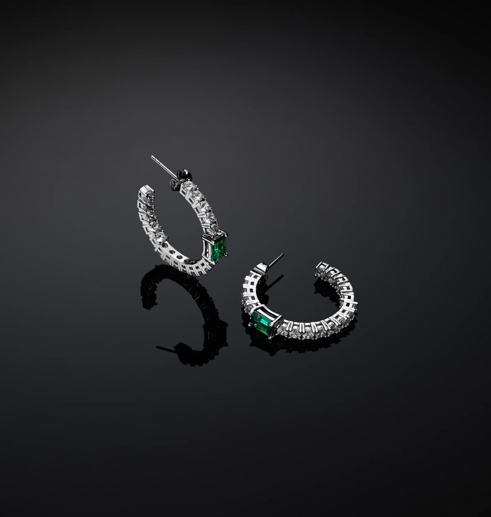 Orecchini a cerchio placcati in argento con zirconi bianchi e zircone centrale verde smeraldo.