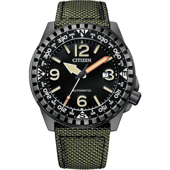 Orologio Citizen solo tempo, referenza NJ2197-19E, cassa in acciaio con trattamento in PVD nero con un diametro di 46mm e fondo serrato a vite. Il quadrante è nero con indici e sfere colore bianco luminol. Le funzioni sono di solo tempo e datario. Il cinturino è in nylon verde. Il meccanismo è automatico. Il vetro è minerale.