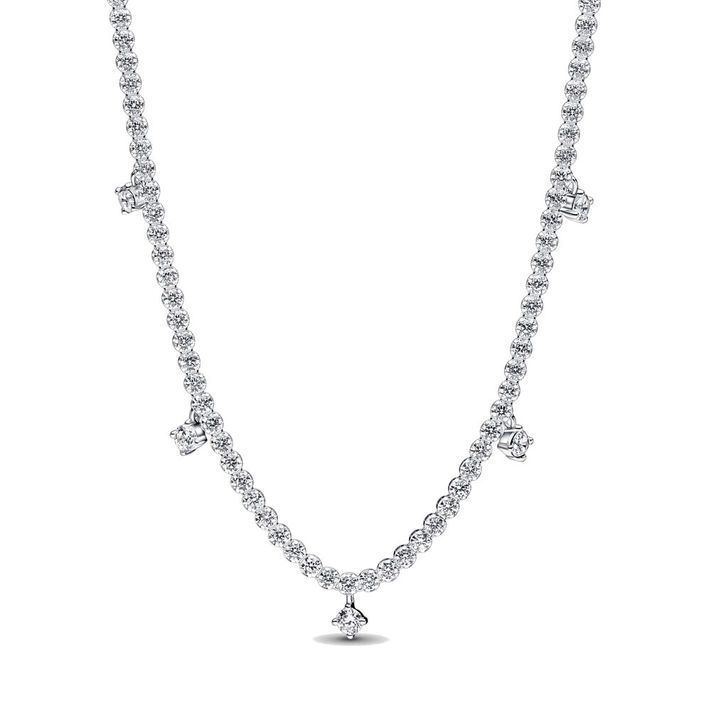 Realizzata in Argento Sterling 925, la collana presenta sfavillanti pietre di zirconia cubica incolore ed è regolabile su tre lunghezze. Caratterizzato da una fila di pavé e da pietre luminose più grandi che pendono dalla fila di pavé su una parte della catena, il gioiello reinterpreta in chiave moderna le classiche forme dei bracciali tennis.