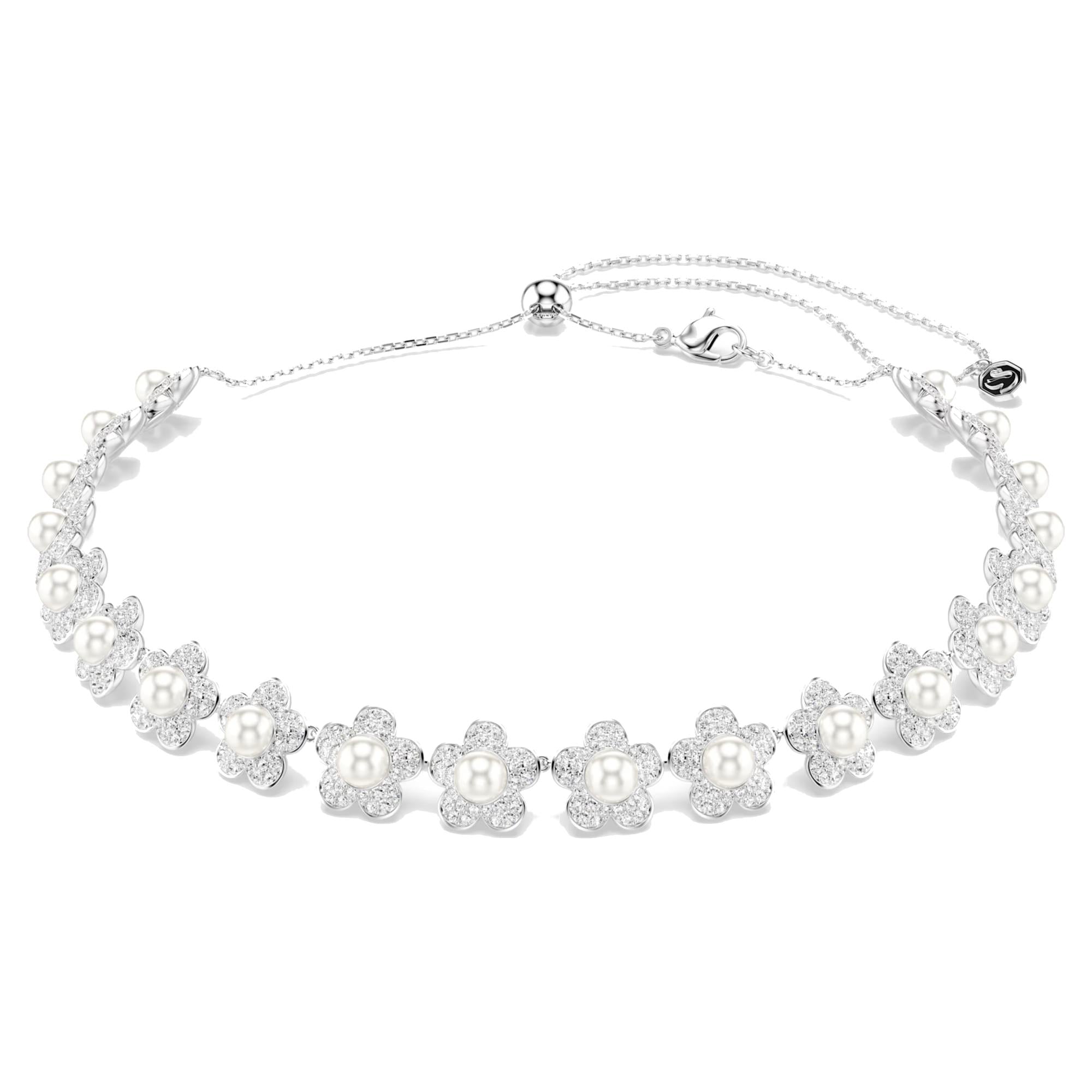 Il design, ispirato alla bellezza della natura, si sviluppa in un delicato filo continuo di fiori, ciascuno impreziosito da una splendida Crystal Pearl Swarovski al centro e petali decorati con un brillante pavé. L'effetto è armonioso e sofisticato, perfetto per donare luce e femminilità a ogni look.