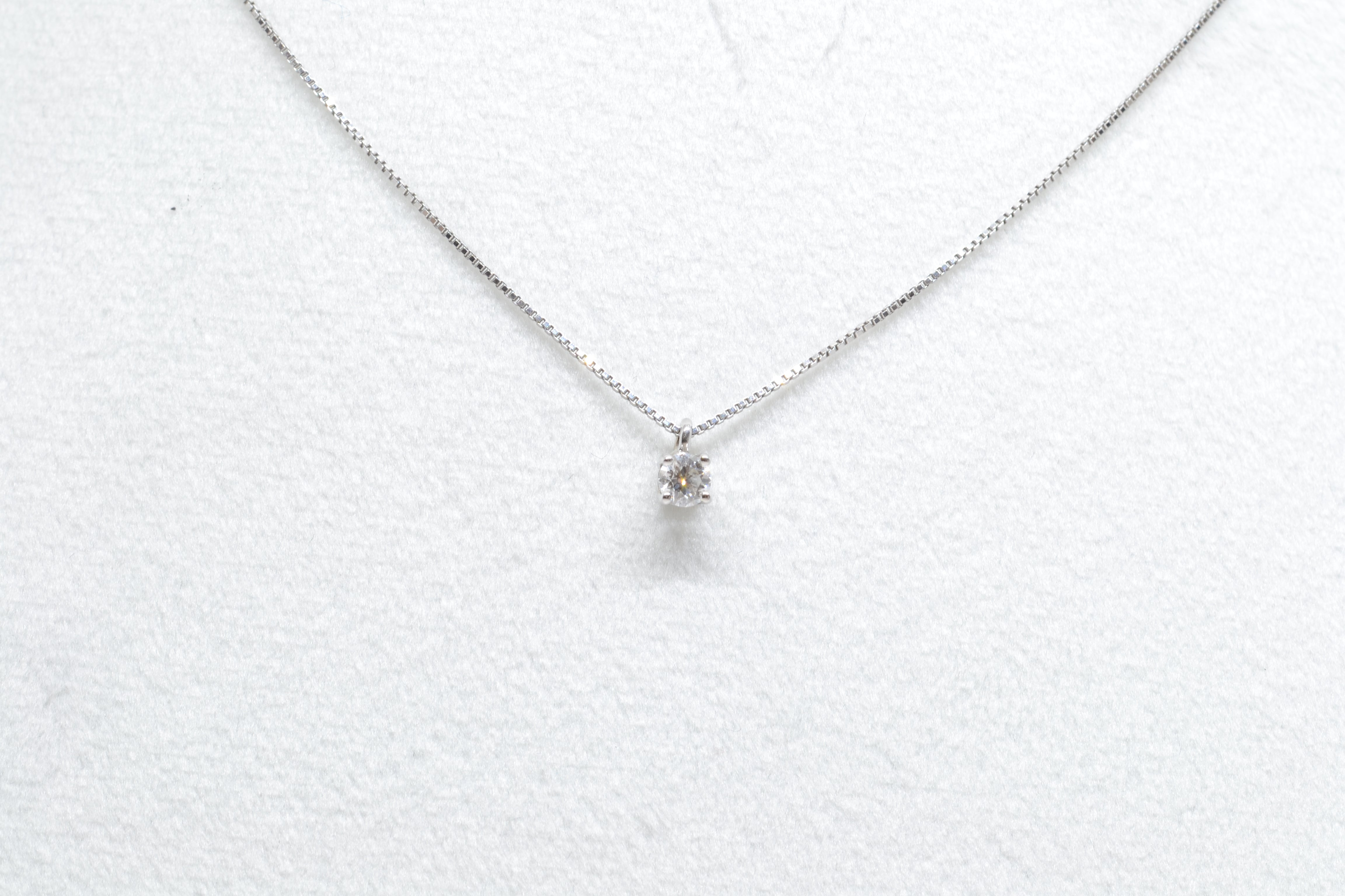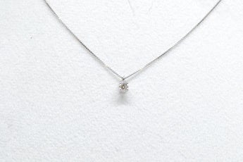 Girocollo in oro bianco 18kt con diamante naturale, il taglio è brillante con una caratura di 0,12 un colore G e qualità VS. La montatura è a 4 griffe. La chiusura è a moschettone.