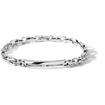 Bracciale in acciaio di Comete Gioielli, referenza UBR578. Il bracciale è fatto a catena con la piastrina centrale, nel centro della piastra c'è incassato un diamante naturale della caratura di 0,05Ct.