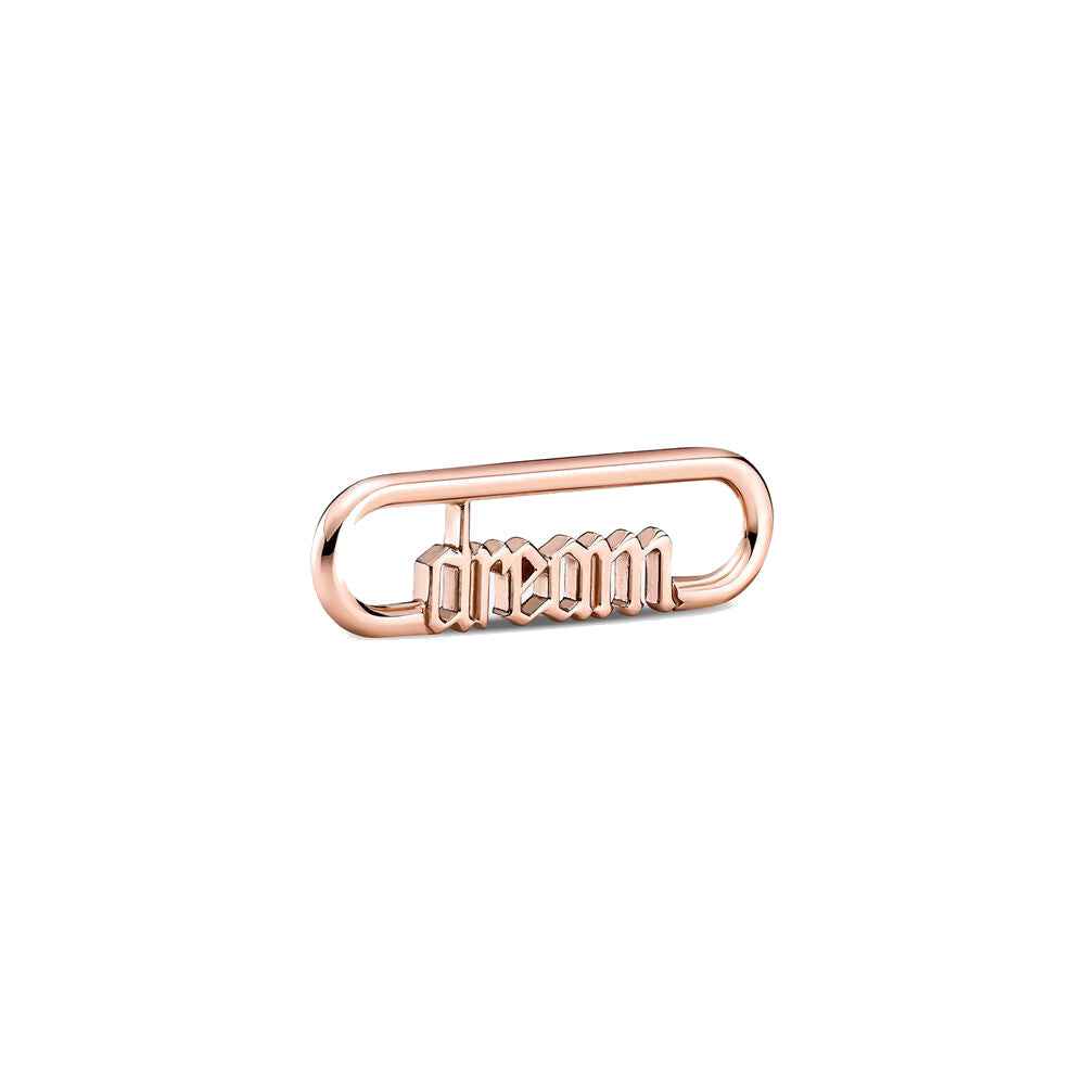 Link "Dream" Pandora ME. La maglia con finitura lucida in lega metallica placcata oro rosa 14k presenta la parola “dream” scritta in caratteri gotici.