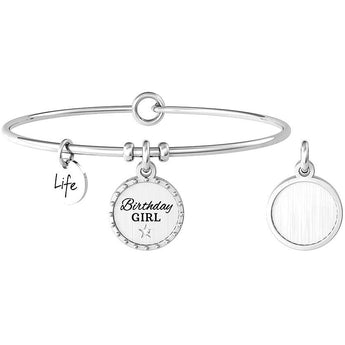 Bracciale Kidult in acciaio inossidabile, diametro interno 6cm, pendente in acciaio con incisione (Birthday girl).