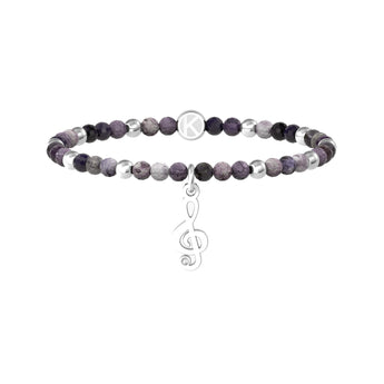 Avere un tocco di stile con questo bracciale Kidult dall'allure unica. Realizzato con acciaio 316L, agata viola e cristallo, questo bracciale misura 18 cm, con un ciondolo a forma di chiave di violino e pietre dal diametro di 4 mm. Ogni bracciale è unico grazie al carattere naturale delle pietre, che regalano un tocco di colore unico.