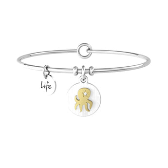 Bangle in acciaio con ciondolo tondo satinato con polipo dorato lucido, cristallo e scritta "Hug me".
