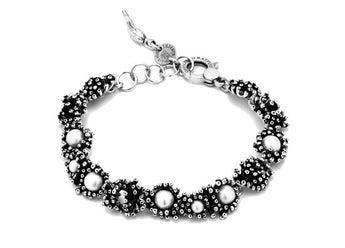 Bracciale Giovanni Raspini, referenza 11264, realizzato in argento 925. Il bracciale Anemone Piccolo, in argento brunito e perle naturali, regala gioia e sincera bellezza, oltre ad un pratico indosso. In esso il decoro naturalistico si fonde con la delicatezza delle perle di fiume e il fascino eterno delle profondità marine.