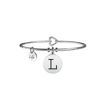 È l'iniziale del tuo nome, di una persona speciale o di qualcuno che ti sta a cuore. La tua lettera preferita, il principio di una parola, una frase, una storia. La vita è un alfabeto di emozioni.Bangle in acciaio con ciondolo tondo con lettera L. • Incisione smaltata sul ciondolo e cristallo sul retro • Chiusura a cuore • Misura unica, diametro 6 cm • Materiale: Acciaio 316L, Cristallo • Designed by Kidult in Italy