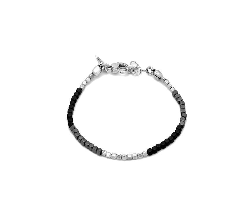 Il bracciale Dadini Grey, realizzato a mano in Italia, incornicia alcuni beads in argento con altri di ematite lucida e satinata, creando un gioiello maschile contemporaneo e di raffinata eleganza. Materiali di qualità ed una lunghezza di 22 cm consentono una chiusura comoda con moschettone e maglie di regolazione.