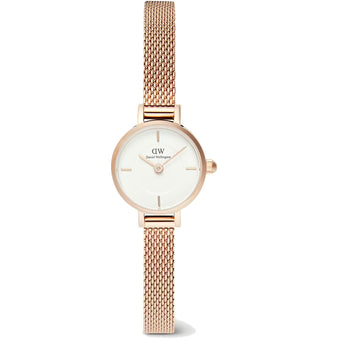 Questo elegante orologio da donna della collezione Petite mini di Daniel Wellington è caratterizzato da una cassa di 19mm e un quadrante bianco. Il cinturino in maglia mesh in acciaio e il colore oro rosa aggiungono un tocco di raffinatezza. Impermeabile fino a 3 ATM, offrendo funzionalità e stile.
