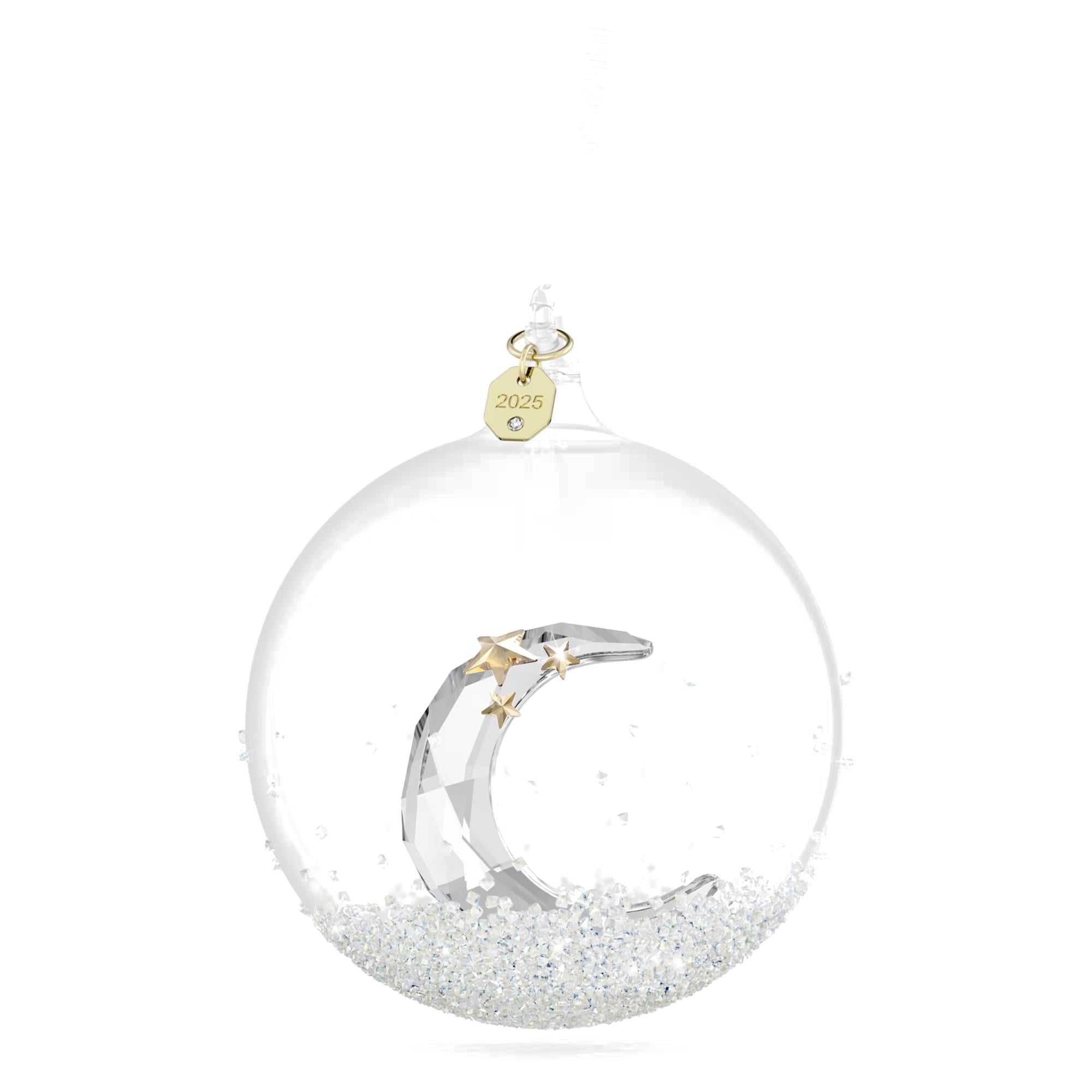 All'interno, una luna crescente dorata, arricchita da stelle luminose e 158 sfaccettature di precisione, aggiunge un tocco di poesia e simbolismo. La pallina è sospesa a un elegante nastro in gros-grain bianco, impreziosito da una placca dorata incisa con l'anno 2025 – perfetta per ricordare un evento speciale come una nascita, un anniversario o un matrimonio.