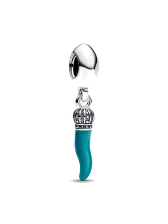 Pendente in Argento Sterling 925 rappresenta un cornino portafortuna, il tradizionale amuleto italiano, dipinto in smalto turchese.