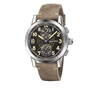 Il quadrante nero è arricchito da numeri arabi con luminescenza vintage, contatori cronografici a ore 12 e ore 6, e una raffinata scala tachimetrica centrale a chiocciola in km/h, per un look ispirato ai cronografi storici. Anche le lancette con luminescenza vintage esaltano il fascino retrò del modello.