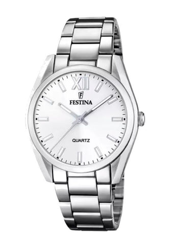 Orologio Festina da donna della linea Alegria, cassa in acciaio inossidabile con un diametro di 36,8 mm e uno spessore di 9,2 mm. Il vetro è minerale mentre il quadrante è di colore bianco. Il movimento è al quarzo con funzione di solo tempo. La resistenza all'acqua è 5 bar.