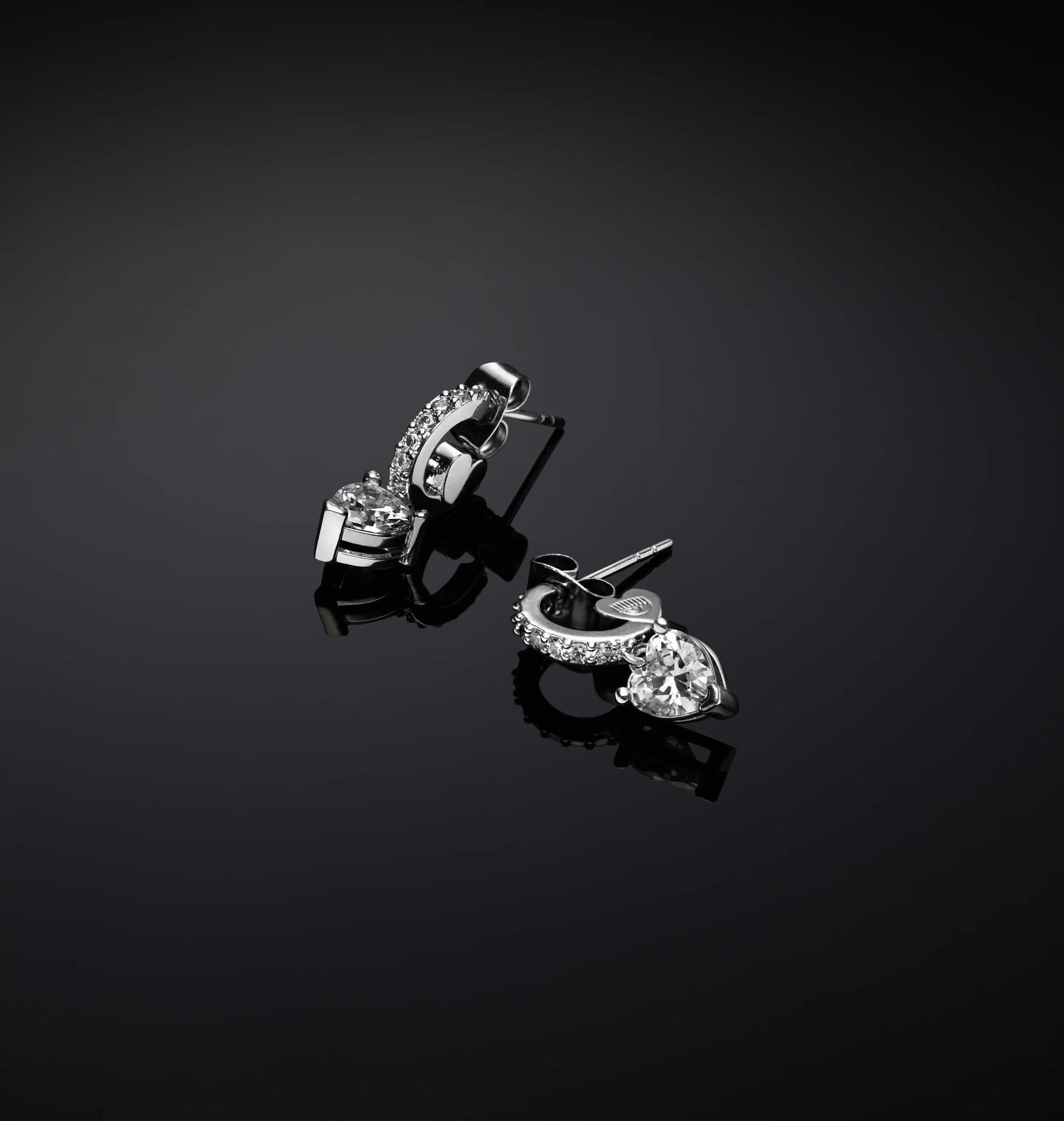 Orecchini a cerchio placcati argento con zircone bianco a forma di cuore.