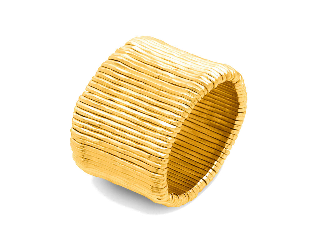 Lasciati conquistare dall'eleganza scultorea di questo bracciale dal forte impatto visivo. La sua texture dinamica e contemporanea cattura la luce con raffinate sfumature, creando un irresistibile effetto di movimento.