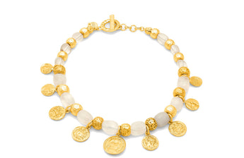 Questa collana iconica unisce armoniosamente il bronzo martellato con bagno d'oro 18 kt ai segmenti in cristallo di rocca, dando vita a un raffinato gioco di contrasti tra luce e matericità. Le monetine decorative in bronzo dorato aggiungono un tocco prezioso e distintivo, mentre la chiusura a T-bar garantisce praticità ed eleganza in un solo gesto.