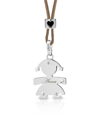 Ciondolo in Oro bianco a forma di femminuccia. Realizzato con due lastre sovrapposte e incastrate fra loro con dei perni in oro. Un Diamantino incastonato nella mano rende il pendente ancora più brillante e prezioso.