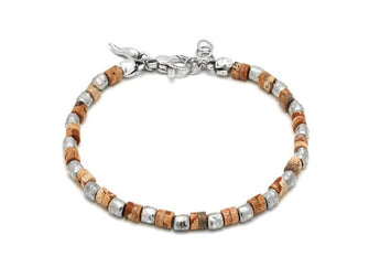 Bracciale Raspini da uomo, realizzato in argento 925 e diaspro color sabbia. La lunghezza è 22 Cm. La chiusura è a moschettone con catenella di regolazione finale.