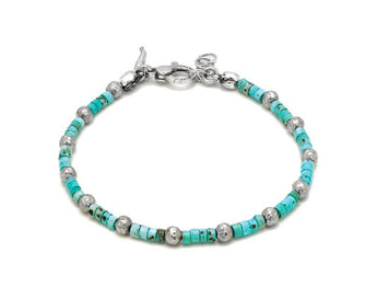 Bracciale Raspini da uomo in argento 925 e Howlite color turchese. La lunghezza è 20Cm. La chiusura è a moschettone con maglie di regolazione finale.