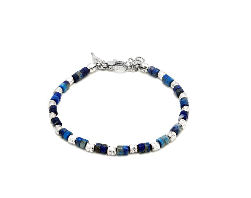 Bracciale Giovanni Raspini Tango, realizzato in argento 925 e lapislazzuli. La chiusura è a moschettone con catenella di regolazione. La lunghezza è di 22cm.
