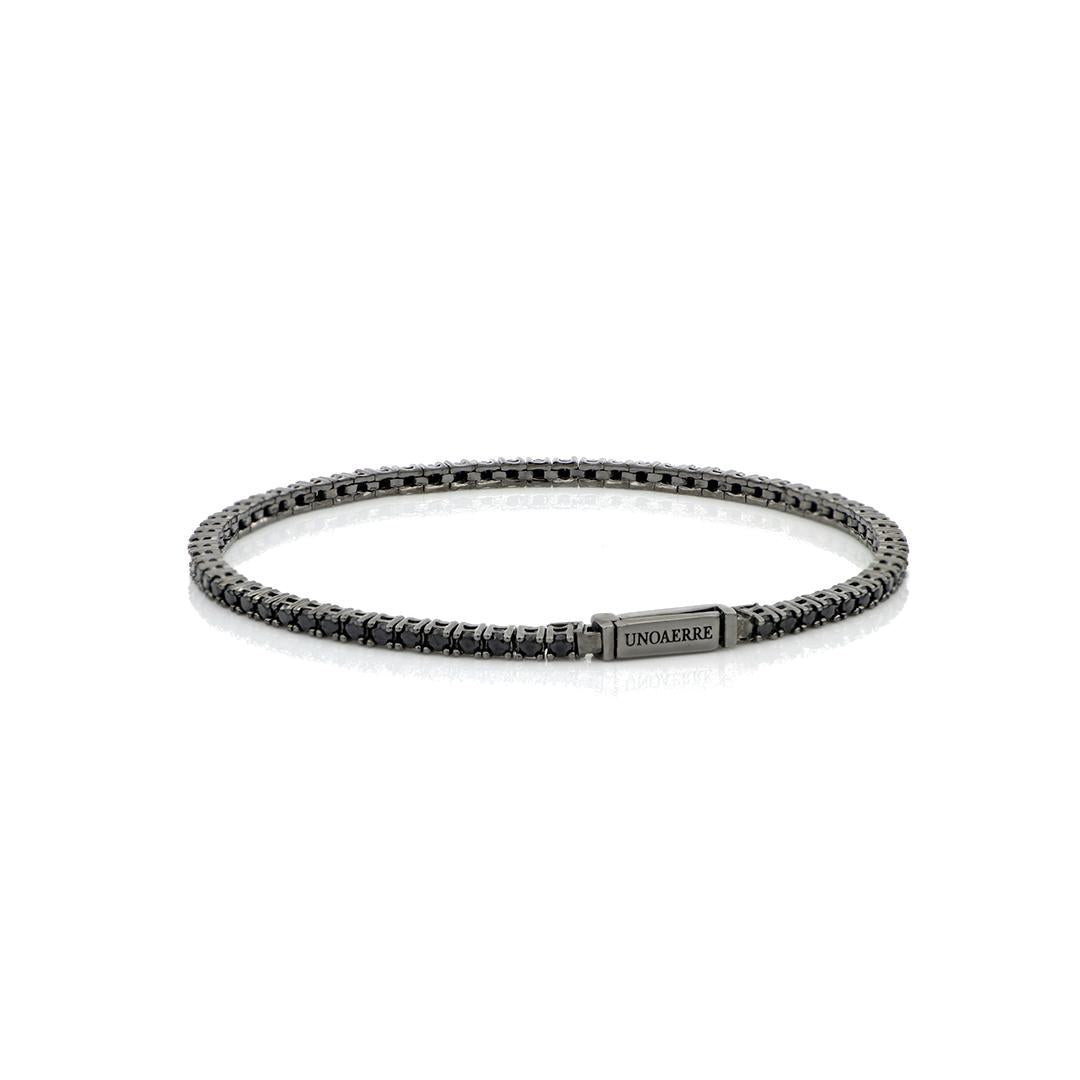 Bracciale tennis in argento 925 con bagno in rutenio, pietre zirconia cubica nere e chiusura a cassetta con logo.