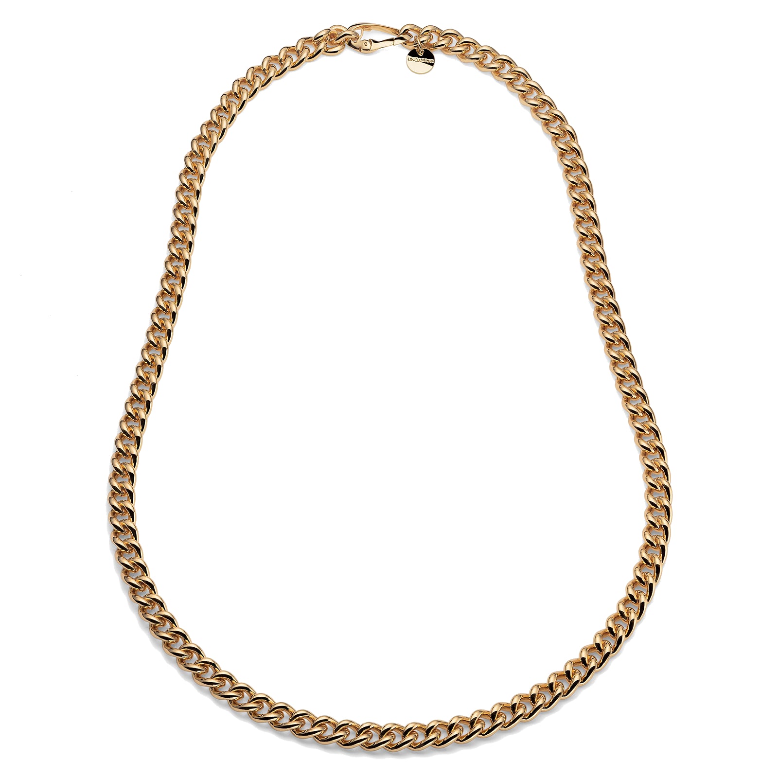 Elegante e raffinata, questa collana lunga in catena grumetta dona un tocco di luce e stile esclusivo a ogni outfit. Realizzata in bronzo e arricchita da un bagno galvanico in oro giallo 24 kt, si distingue per la sua finitura lucida che cattura la luce con eleganza.