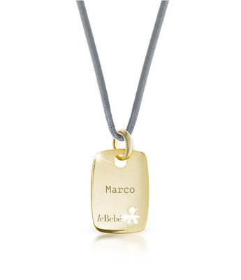 Piastrina in oro giallo 9kt. Nella piastrina troviamo la sagoma del maschietto traforata. Il ciondolo è accompagnato dal cordino in tessuto.
