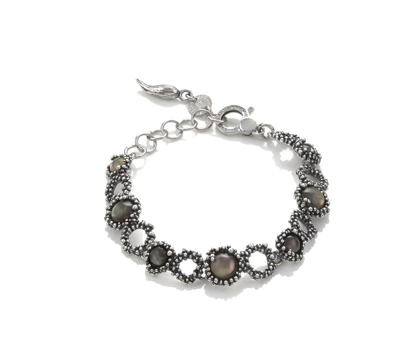 Bracciale Giovanni Raspini della collezione Maui, realizzato in argento 925 con lavorazione brunita e madreperla con quarzo ialino. La lunghezza è 19 cm, chiusura a moschettone.