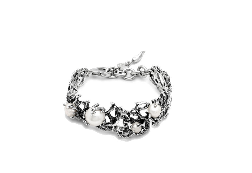 Un gioiello che racconta il fascino dei fondali marini con l'eleganza del design contemporaneo. Il bracciale Mari del Sud è realizzato in argento 925 brunito, modellato a mano in ricami che richiamano i coralli, e intrecciato con perle naturali scaramazze, ognuna unica nella sua forma irregolare e nella sua lucentezza morbida.