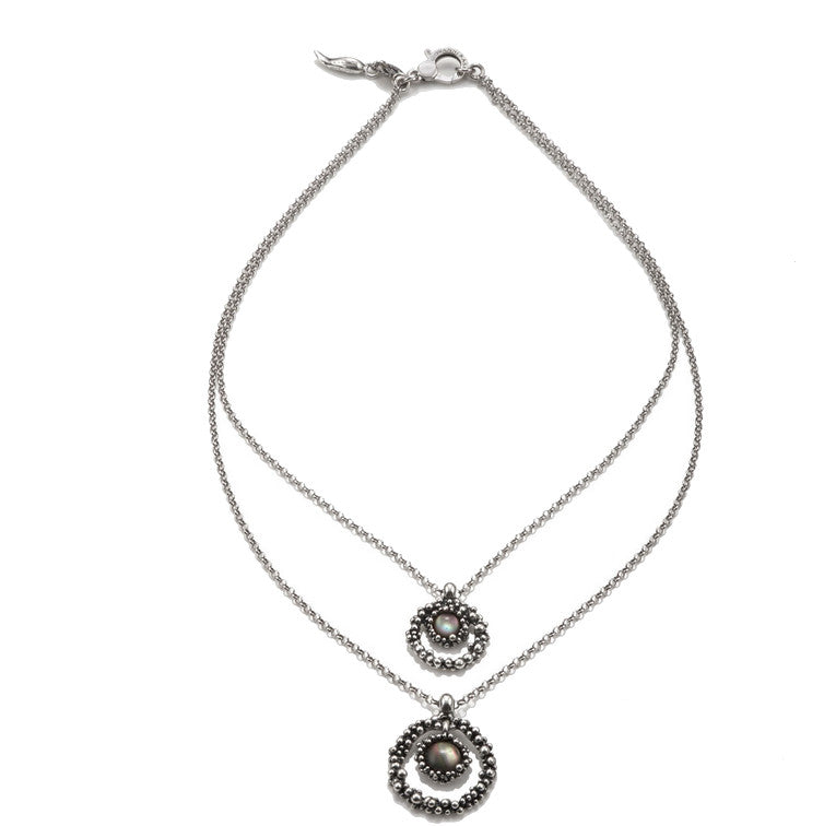 I colori dell'alba che si riflette sull'oceano prendono forma in questa raffinata collana a doppio pendente della Collezione Maui. Due delicate madreperle, doppiate con quarzo ialino, sono incorniciate da cerchi di sferette in argento 925, creando un gioco di luce e riflessi rosa, verdi e cilestrini che donano luminosità e poesia al décolleté.