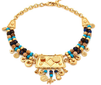 Collana Giovanni Raspini della collezione Tuareg, realizzata in argento con bagno in oro giallo e impreziosita da pietre come il turchese, agata blu con bronzite e pietra paesina.