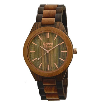 Orologio Green Time, realizzato in legno di noce e sandalo, cassa in legno con un diametro di 44mm, quadrante nero con indici e lancette argentate, il cinturino è in legno con uno spessore di 24mm, la chiusura è a scomparsa. Il meccanismo è al quarzo con funzione di solo tempo.