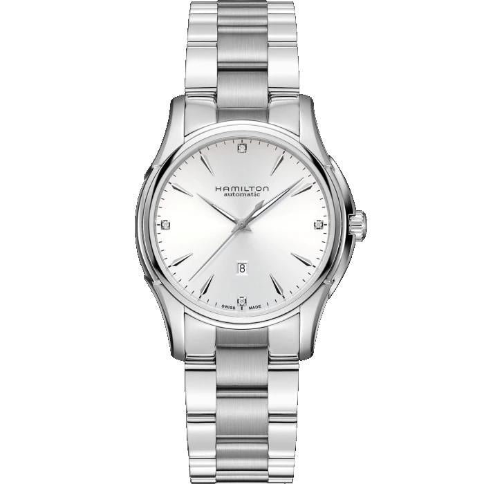 Orologio Hamilton Jazzmaster Lady Auto, referenza H32315111, cassa in acciaio inossidabile di forma rotonda con un diametro di 34mm. Il vetro è in zaffiro antigraffio. Il quadrante è di colore bianco con indici applicati colore silver. Il meccanismo è a carica automatica calibro 2671 con una riserva di carica di 43 ore circa. La resistenza all'acqua è di 5 bar.