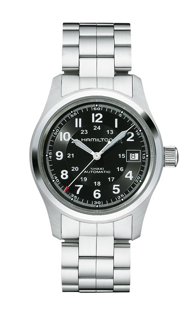 Khaki Field Auto Orologio dalle linee Semplici e Spartane, ha Cassa e Bracciale in Acciaio, il quadrante è di colore Nero con numeri Arabi Bianchi. Le sfere sono luminescenti. Indicazione di Ora e Data, il vetro è Zaffiro Antigraffio.