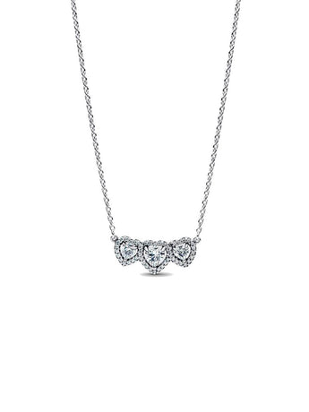 Per il passato, il presente e il futuro. Questa collana in Argento Sterling 925 è impreziosita da tre pietre a forma di cuore, armoniosamente collegate da un raffinato pavé di punti luce che esalta la brillantezza del design.