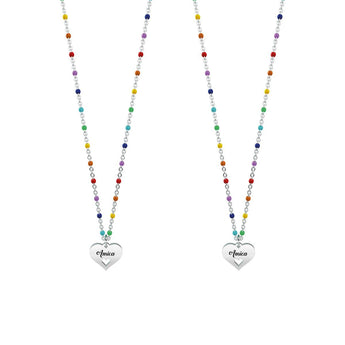 Sei l'amica che so di avere sempre accanto anche dall'altra parte del mondo.Set di due collane corte in acciaio con ciondolo a cuore e catena rolò con inserimenti in smalto multicolor. • Incisione smaltata sul ciondolo e inserimenti in smalto sulla catena • Chiusura con moschettone • Misura unica, lunghezza 44 cm • Materiale: Acciaio 316L, Smalto • Designed by Kidult in Italy