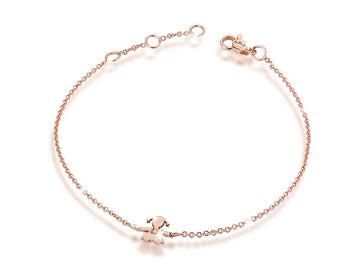 Bracciale realizzato in oro rosa 18kt. La catena è una maglia rolò con la possibilità di regolare la lunghezza e il moschettone logato. Il ciondolo è a forma di femminuccia con al centro incassato un diamante taglio brillante di caratura 0,03ct con purezza VS, colore G.